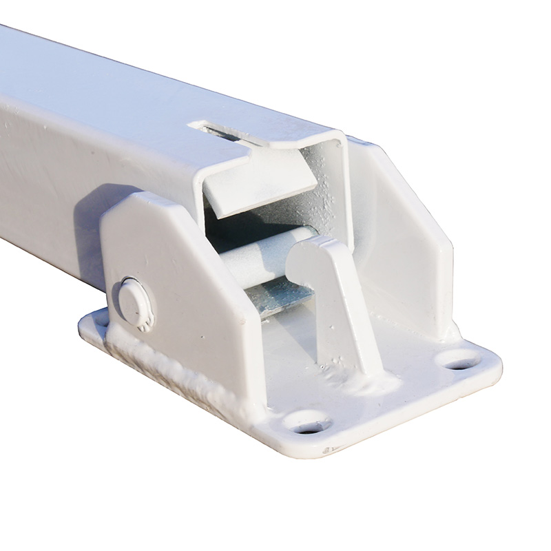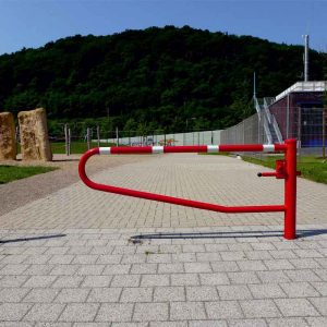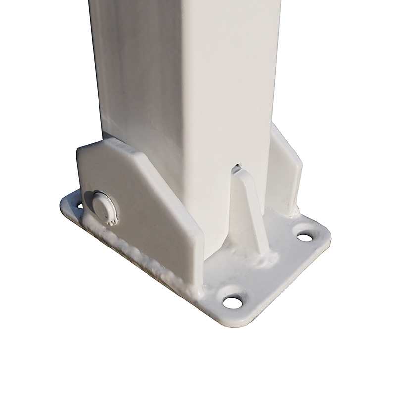 Als umlegbarer Sperrpfosten ist eine Ausführung mit Bodenplatte 100 x 150 mm zum Aufdübeln auf den Boden oder mit einer Bodenhülse aus Stahl zum Einbetonieren lieferbar.