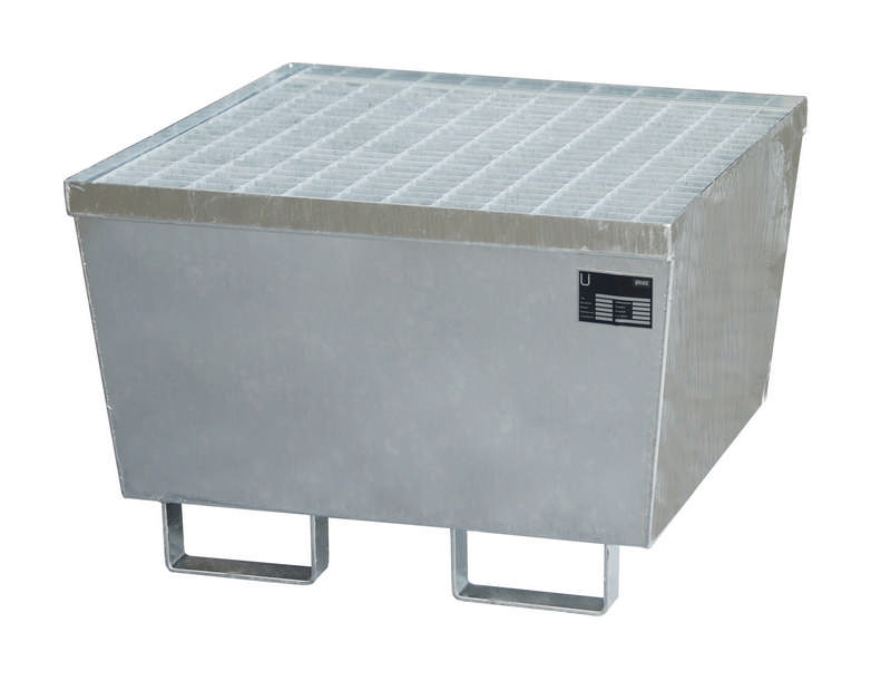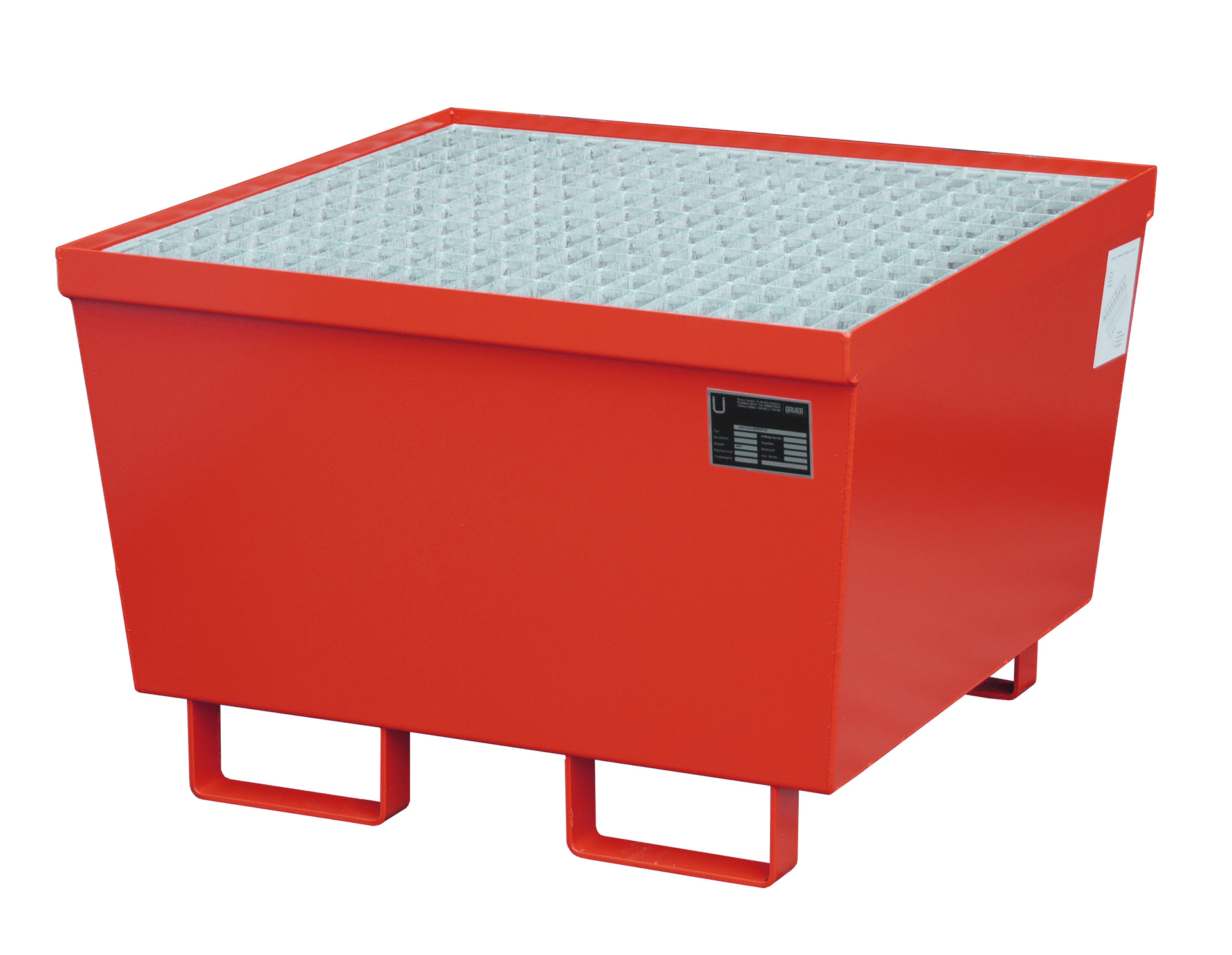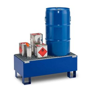 Lagerung von 200-l-Fässern, auch mit 60-l-Fässern und Kleingebinden kombinierbar —- Konstruktion aus 3 mm Stahlblech — 100 mm Unterfahrhöhe — Konische Bauform — Ineinander stapelbar — Verstärkt durch beidseitige Randprofilierung — Transportabel mit Gabelhubwagen und Gabelstapler — Mit verzinktem Gitterrost — Tragfähigkeit 1000 kg/m² — Mit Übereinstimmungserklärung (ÜHP) gem. StawaR — Zugelassen für entzündbare Flüssigkeiten der GHS-Kategorien 1-3 — Zugelassen für gewässergefährdende Flüssigkeiten der GHS-Kategorien 1-4