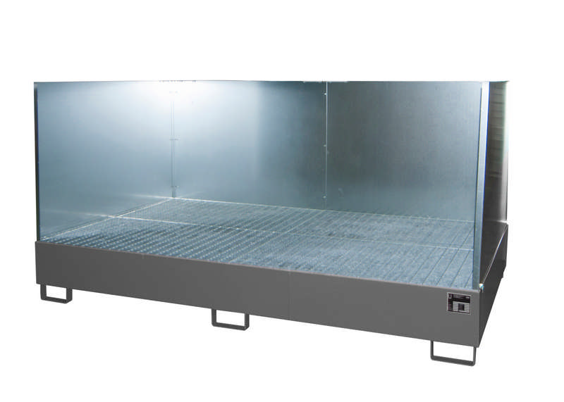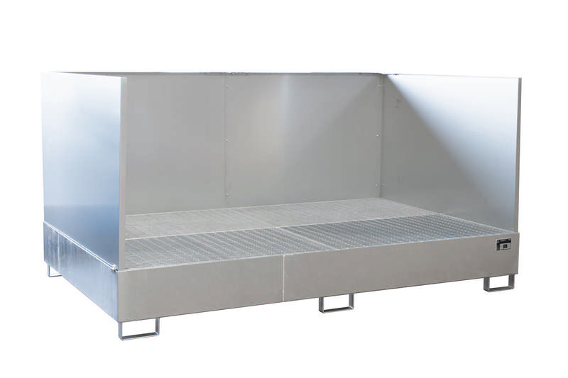 Auffangwanne Typ AW 1000-10F/SW, mit 3-seitiger Spritzschutzwand, max. Anzahl 10x200lFässer/2x1000l-IBC, versch. Farben o. Feuerverzinkt
