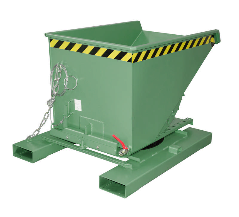 Der stabile Grundrahmen des Kippbehälters verfügt über Einfahrtaschen, die den einfachen Transport mit einem Gabelstapler ermöglichen und die Mobilität verbessern. Zusätzlich gibt es eine Sicherungsvorrichtung, die unbeabsichtigtes Abrutschen und Auskippen verhindert, wodurch die Arbeitssicherheit gewährleistet wird.