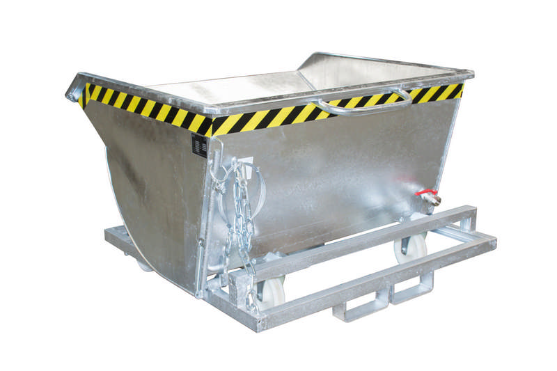 Das Wannenblech des Spänebehälters ist mit einem umlaufenden Randprofil ausgestattet, um ein sicheres Sammeln von Materialien zu gewährleisten. Der stabile Grundrahmen verfügt über Einfahrtaschen, die den einfachen Transport mit einem Gabelstapler ermöglichen. Zusätzlich gibt es Sicherungen, um unbeabsichtigtes Abrutschen und Auskippen zu verhindern.