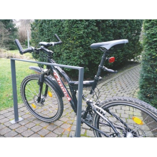 Die Anlehnbügel liefern wir auch mit einem zusätzlichen Querholm. Dadurch erhöht sich die Stabilität und der Knieholm bietet eine weitere Anlehnfläche. Die Fahrradanlehnbügel aus Flachstahl werden feuerverzinkt geliefert und sind dadurch extrem witterungsbeständig. Farblich bieten wird die Stahlbügel auch in der beschichteten Ausführung im Farbton DB 703 Eisenglimmer/dunkelgrau an.