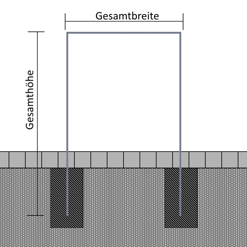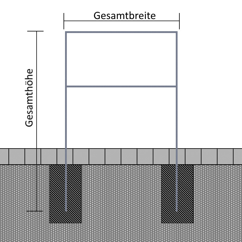 Die zweibeinigen Flachstahlbügel betonieren Sie im Boden ein. Als Auszugssicherung aus dem Betonfundament liefern wir 2 Erdanker aus Rundstahl mit. Die Löcher im Ständerwerk unten sind entsprechend vorgebohrt.