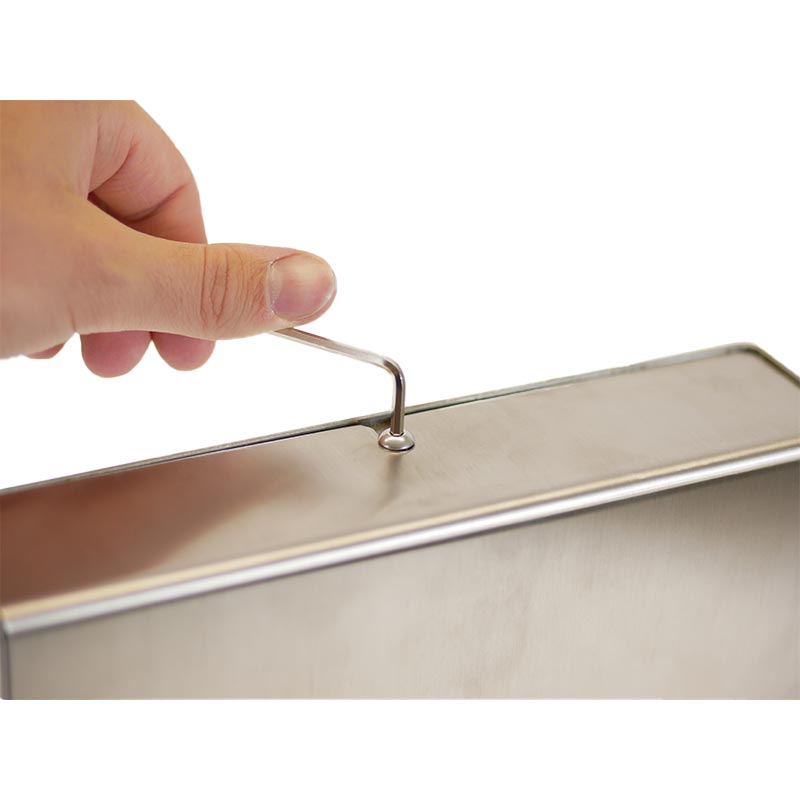 Das Fassungsvermögen im flachen Gehäuse aus Edelstahl von bis zu 700 Tüten aus Plastik, sorgt für einen großen Vorrat. Zum Nachfüllen der Beutel wird der Hundekotbeutelspender Balto mit einem Inbus-Schlüssel geöffnet.