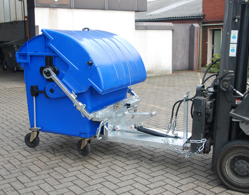 Die Hilfe beim Transportieren, Abkippen und Reinigen von Müllgroßbehältern (1.100 l mit 4 Rädern) nach DIN EN 840-3 —- Stabiler Grundrahmen mit Einfahrtaschen — Sicherung gegen unbeabsichtigtes Abrutschen — 2 Bolzen (für MGB aus Stahl) bzw. 2 abklappbare Aufnahmearme (für MGB aus Kunststoff) sichern den MGB — Stahlseil sichert den geöffneten Deckel — Kippvorgang erfolgt über Staplerhydraulik, Betriebsdruck mind. 130 bar — Vor- und rückkippbar — Kippgeschwindigkeit stufenlos über Drosselventile einstellbar — Vorrichtung zur Aufnahme der Hydraulikschläuche, Stahlseil und Sicherungskette