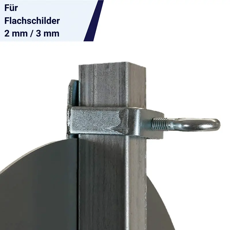 Pro Schild empfehlen wir 2 Klemmschellen für eine sichere Anbringung. Die Schelle eignet sich für Flachschilder, Alformschilder und Randformschilder.