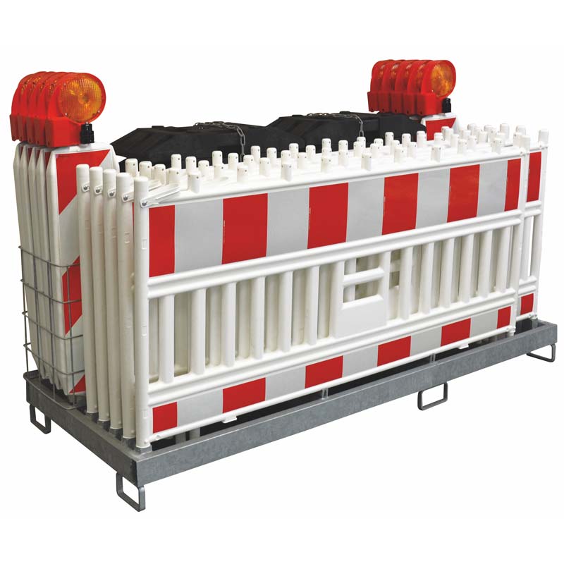 Das Gestell für Absperrmaterial besitzt an allen Seiten Staplertaschen. Sollte das Gestell nicht gleichmäßig beladen sein, verhindert eine Kippsicherung das Umfallen oder Verrutschen.