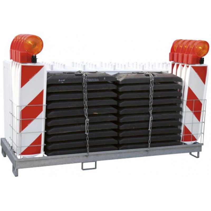 Das stabile Kombinationsgestell verfügt über Extrafächer für die Leitbaken (auch mit Warnleuchten bestückt), damit diese aufrecht stehen und sich nicht gegenseitig beschädigen.