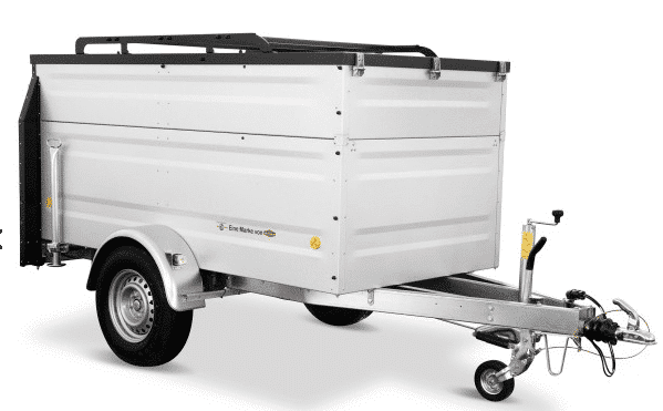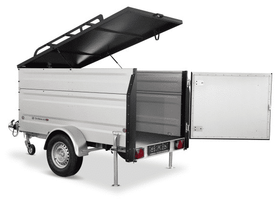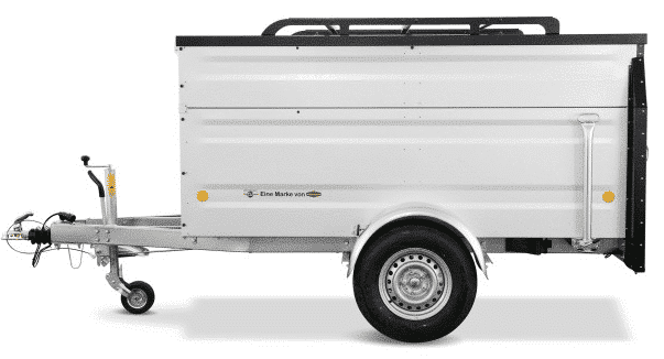Einachsiger gebremster Kofferanhänger mit nach oben aufstellbarem und abschließbarem spritzwassergeschütztem Deckel. Der schwarze KTL- und pulverbeschichtete Deckel ist serienmäßig mit einer Reling ausgestattet, so dass Sie problemlos Fahrradträger oder Dachboxen montieren können. Desweiteren hat dieser Kofferanhänger eine erhöhte Bordwand, so dass bei einer Innenhöhe von etwas über 1 m der Transport von z.B. Fahrrädern im Innenraum möglich ist. Wenn Sie ein Dachzelt auf den Deckel montieren möchten, benötigen Sie 2 zusätzliche Stoßdämpfer, um die Deckeltraglast von 75 kg auf 250 kg zu erhöhen.