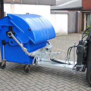 Zur Entleerung und Reinigung von 240-l-Mülltonnen —- Robuste Stahlkonstruktion — Einfahrtaschen für Gabelzinken-Aufnahme — Geeignet für Gabelstapler, Radlader und weitere Trägerfahrzeuge mit Gabelzinken — Sicherung gegen unbeabsichtigtes Abrutschen und Abkippen — Beim Abkippen sichern selbsttätig arretierende Haken die Mülltonne — Kippvorgang erfolgt über Zugseil