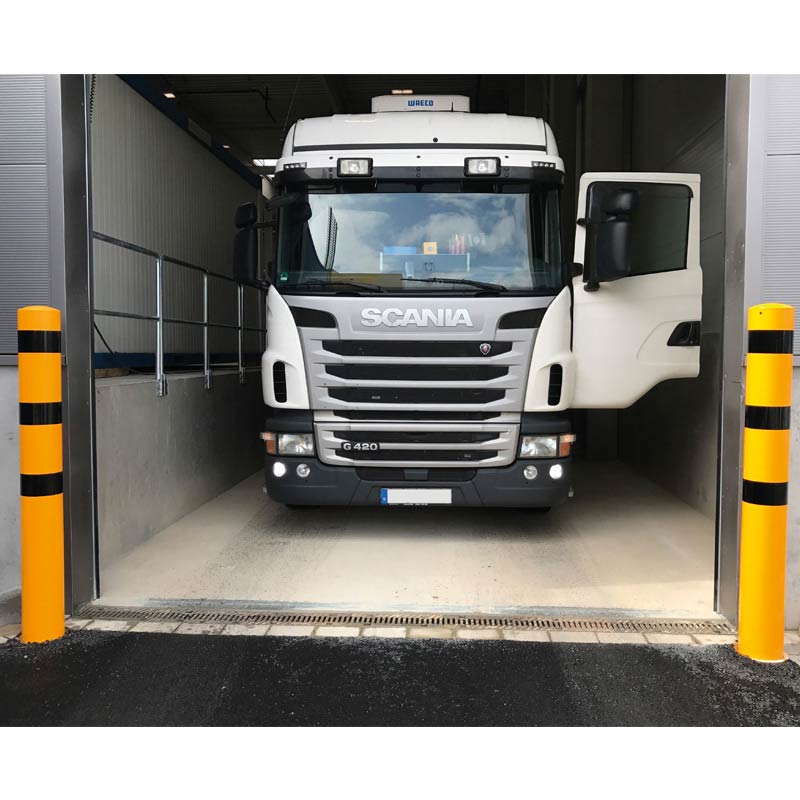 Ob vor Maschinen, Pfeilern, Ein- und Ausfahrten oder an Gebäudeecken – der Schutzpoller ist dank seiner Farben und des großen Durchmessers sehr gut sichtbar. Das Stahlrohr ist in Gelb mit dem RAL-Farbton 1003 (Abbildung ähnlich) beschichtet und mit schwarzen Streifen versehen.