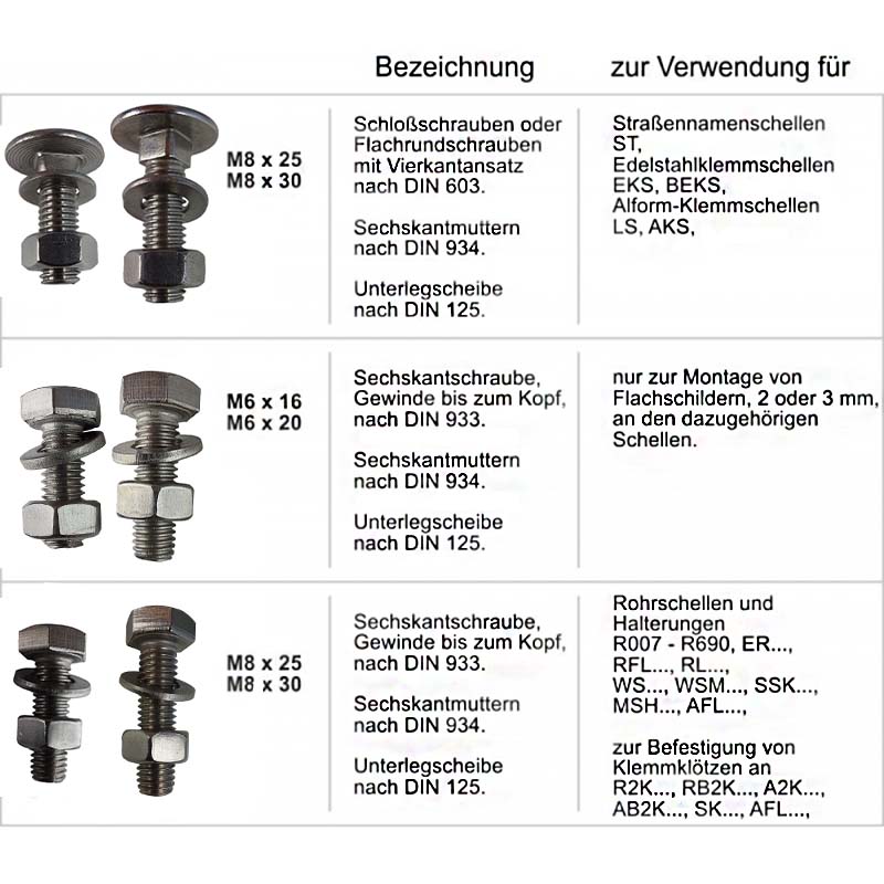 Sie benötigen pro Schilderschelle 2 Schraubensätze. Ebenso beim Anschrauben der Verkehrszeichen am Schilderhalter. Bei Verwendung von 2 Schellen pro Schild bitte die doppelte Menge (4 Sets) bestellen.