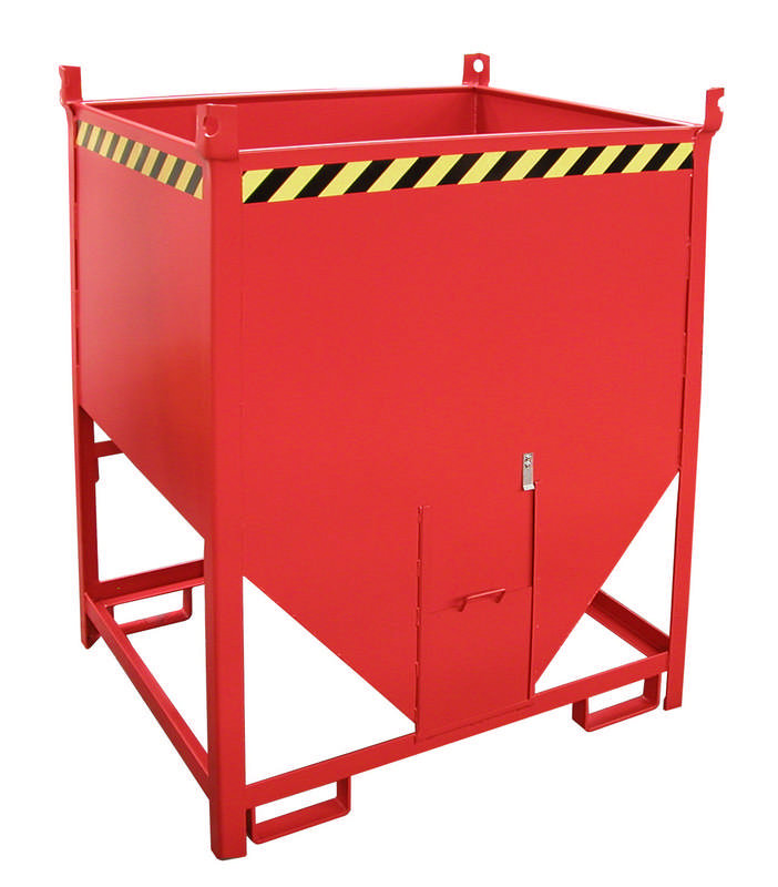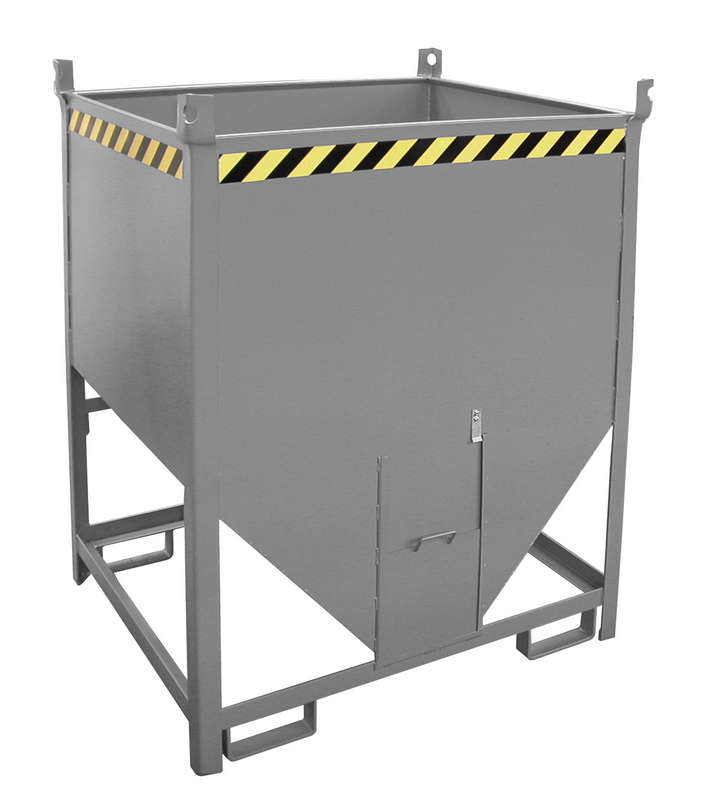 Sammlung und stirnseitige Entleerung von Schüttgütern —- Trichter aus Stahlblech mit umlaufender Verstärkung — Bodenschräge 30 Grad — Grundrahmen mit Einfahrbügeln — Sicherung gegen unbeabsichtigtes Abrutschen — Aufnahmen für Gabelstapler und Kran — Mit Gabelhubwagen transportierbar — 3-fach stapelbar — Stirnseitiger, arretierbarer Schieberverschluss per Hand zu betätigen — Öffnung (BxH) = 250 x 250 mm