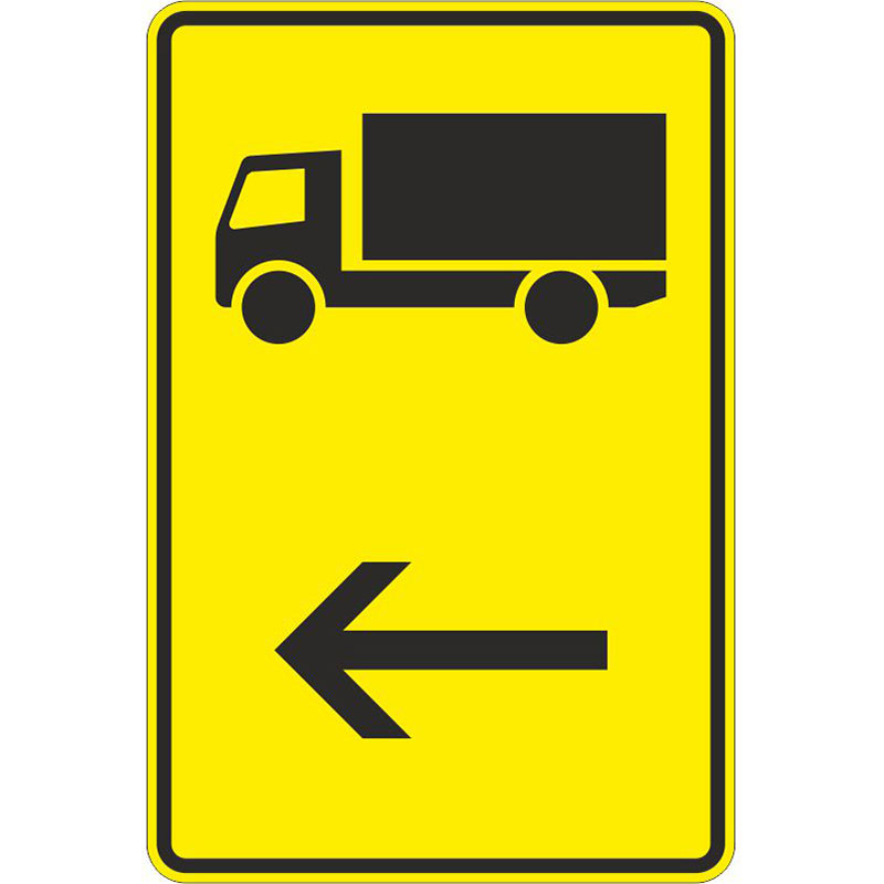 Das Verkehrszeichen 422-10 „Wegweiser für Kfz mit einer zul. Gesamtmasse über 3,5 t, hier links“ ist ein hochkant anzubringendes Rechteckschild mit gelbem Grund und schwarzer Beschriftung. Es zeigt oben das Piktogramm eines LKW mit Fahrtrichtung nach links, darunter einen links weisenden Pfeil.